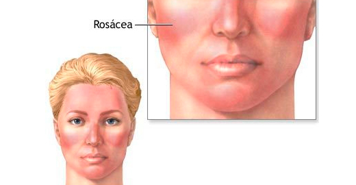 La rosácea es una enfermedad que afecta en general a personas de piel blanca y con ascendencia europea. Comienza como un eritema (enrojecimiento) en la parte central de la cara o en las mejillas, nariz, o frente. Cuando la rosácea progresa, puede desarrollar un eritema semi-permanente, telangiectasias (pequeños vasos), pápulas enrojecidas y pústulas, enrojecimiento ocular, ardor y picazón
